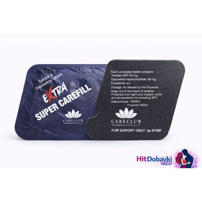 EXTRA SUPER CAREFILL 100 mg е нов революционен продукт комбиниращ действието на Tadalafil 40 mg ( Generic Cialis, Генерик Циалис ) ( за много по-корава, стабилна и качествена ерекция продължаваща повече от 52 часа ) и Dapoxetine 60 mg ( за лечение на преждевременна еякулация и бързо изпразване ). Предимствата са очевидни: оптимално сексуално представяне с невероятно корава и стабилна ерекция съпроводена със значително задържане и контрол на изпразването.